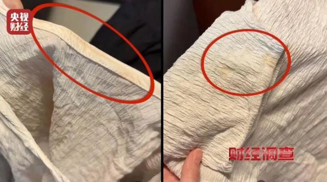 有些直播间宣称卖“新品样衣”“大牌尾货”,实际上却在大量低价销售二手旧衣服。记者根据线索,从一个直播间仅花6元购得3件包邮的所谓“样衣尾货”。这些衣物乍看尚可,细看却破绽明显:白色上衣领口、腋下有黄渍和粉底印,黑色短裙裙摆沾有油渍,白色上衣下摆和腋下存在脱线问题,显然都是被穿用过的二手旧服。