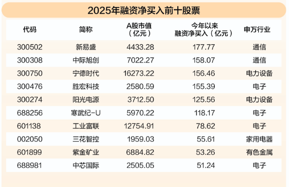 融资净买入靠前的股票中,大部分属于AI、人形机器人、半导体、储能、存储芯片等科技题材。数据显示,今年以来融资净买入最高的前3只股票是新易盛、中际旭创、宁德时代,融资净买入额分别达到177.77亿元、158.07亿元、156.46亿元,这3只股票分别与光模块、动力电池相关,其中新易盛、中际旭创年内涨幅均超过400%。PCB龙头胜宏科技、储能龙头阳光电源(300274)、AI芯片龙头寒武纪-U今年以来融资净买入也在百亿元以上。