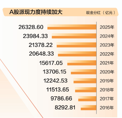 A股上市公司分红正迈入高质量发展的新阶段。截至12月30日收盘,按除权除息日期统计,2025年A股公司派现总金额高达2.6万亿元,创历史新高。它标志着A股市场正从过去偏重融资功能,向投融资并重,甚至更加注重投资回报的良性生态演进。